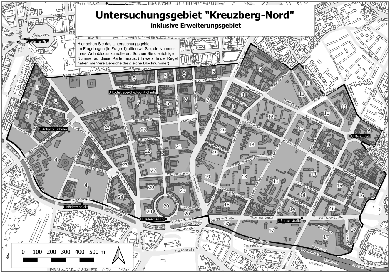 Das Gebiet „Kreuzberg-Nord“ umfasst Wohngebiete im nordwestlichen Teil Kreuzbergs rund um die Gitschiner Straße, Alexandrinenstraße und Mehringplatz. Es werden zusätzlich weitere Wohngebiete um den Askanischen Platz und Moritzplatz sowie südlich der Rudi-Dutsche-Straße und für eine Erweiterung geprüft. Rücksendefrist ist der 27. Juli 2025. Weitere Informationen zum Gebiet können Sie hier nachlesen: Seite des Erhaltungsgebietes Kreuzberg-Nord.