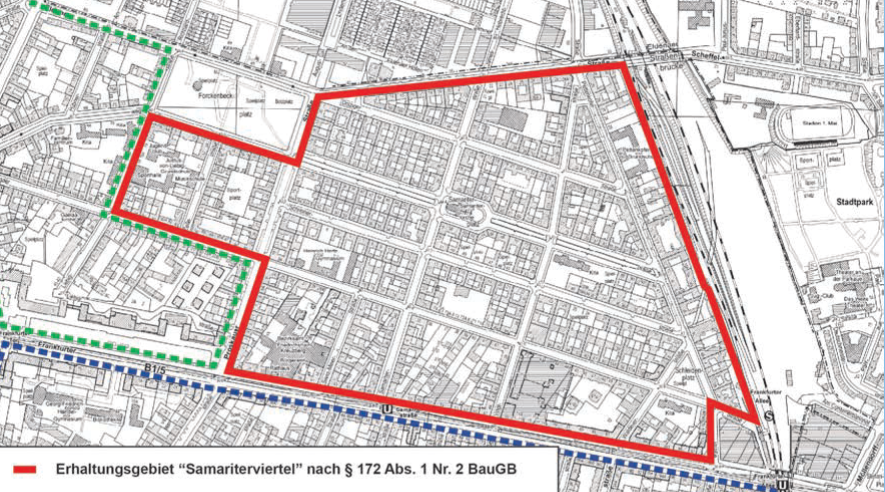 Das Gebiet „Samariterviertel“ liegt nördlich der Frankfurter Allee, reicht im Norden bis zur Eldenaer Straße, bis zur Liebigstraße im Westen und bis zur Pettenkofer Straße im Osten. Rücksendefrist ist der 27. Juli 2025. Weitere Informationen sind hier zu finden: Seite des Erhaltungsgebietes Samariterviertel.